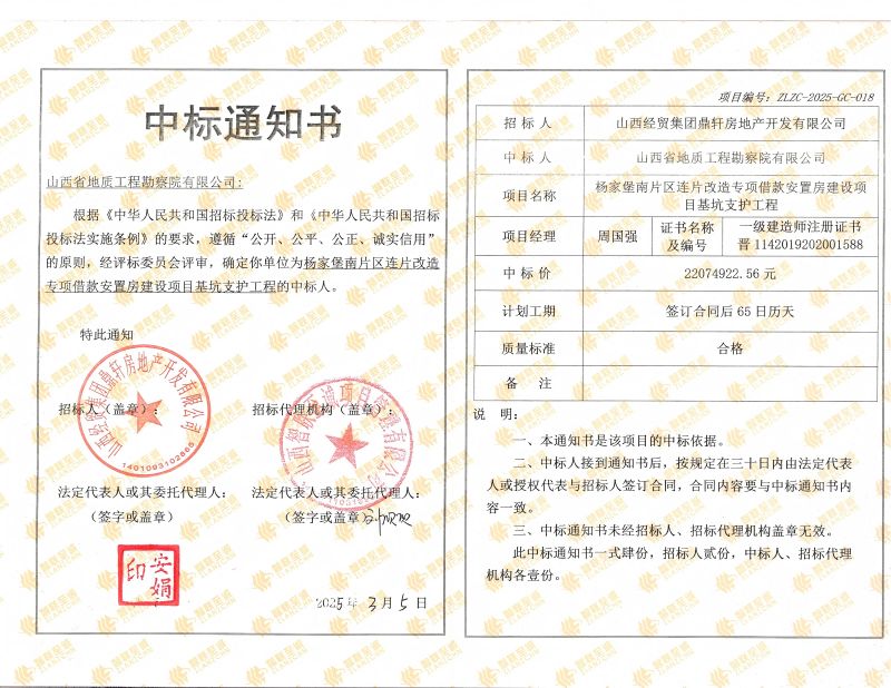 近日,我公司下属岩土工程公司中标《杨家堡南片区连片改造专项借款安置房建设项目基坑支护工程》项目,中标金额:22074922.56元。